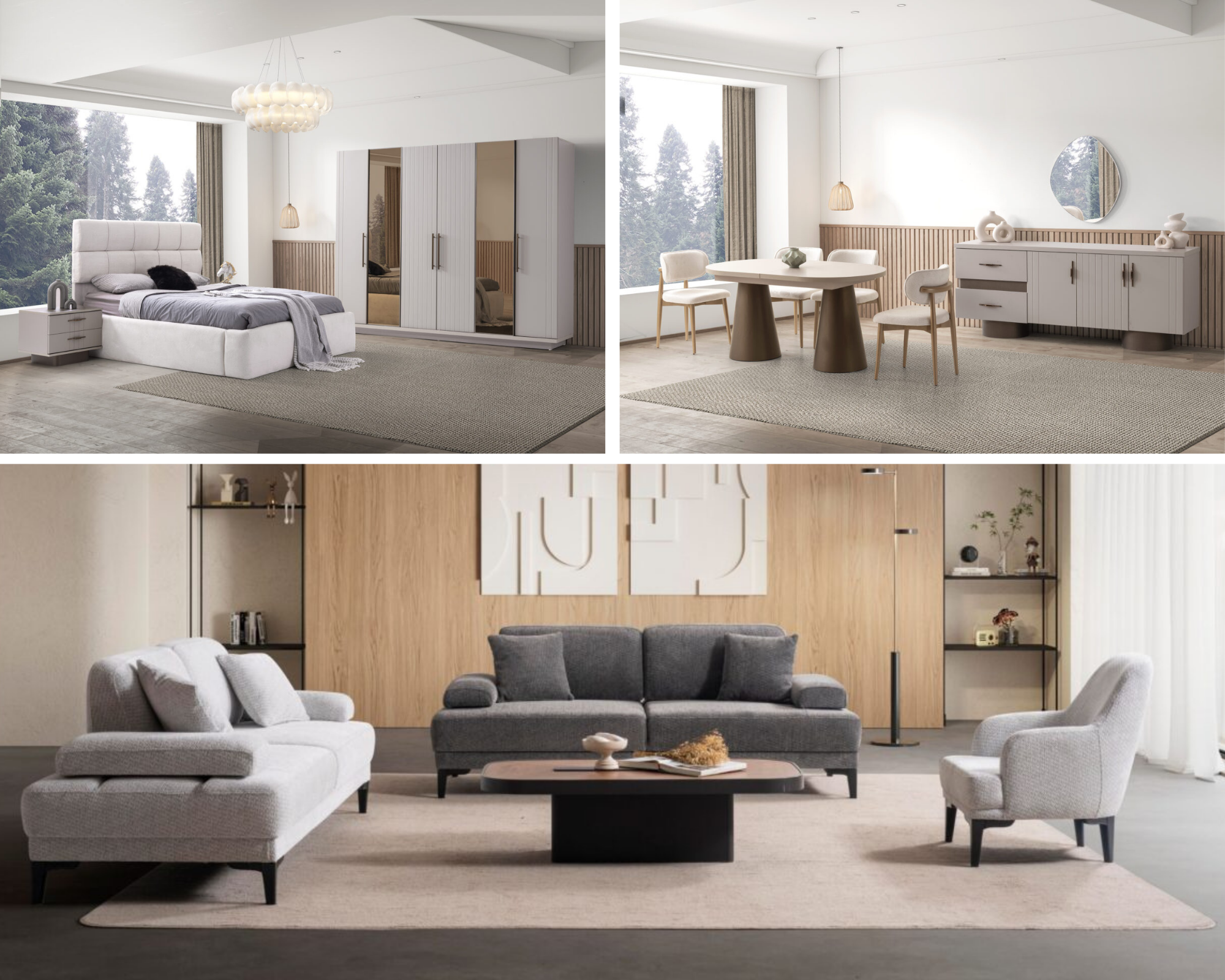 Takım İçeriği 1 Adet Gardırop (6 Kapaklı), 1 Adet Karyola ve Başlığı, 2 Adet Komodin, 1 Adet Şifonyer ve Aynası, 1 Adet Konsol, 1 Adet Konsol ayna, 1 Adet Masa,  4 Adet sandalye, 2 adet 3’lü Koltuk ve 1 adet Berjerden oluşmaktadır.