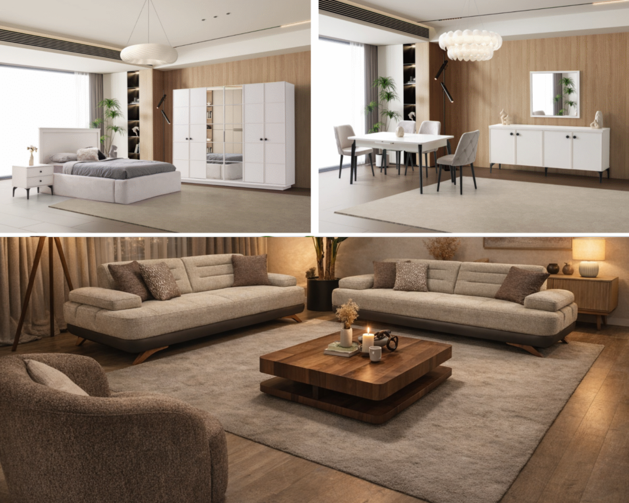 Takım İçeriği 1 Adet Gardırop (6 Kapaklı), 1 Adet Karyola ve Başlığı, 2 Adet Komodin, 1 Adet Şifonyer ve Aynası,1 Adet Konsol, 1 Adet Konsol ayna, 1 Adet Masa,  4 Adet sandalye,2 adet 3’lü Koltuk ve 1 adet Berjerden oluşmaktadır.